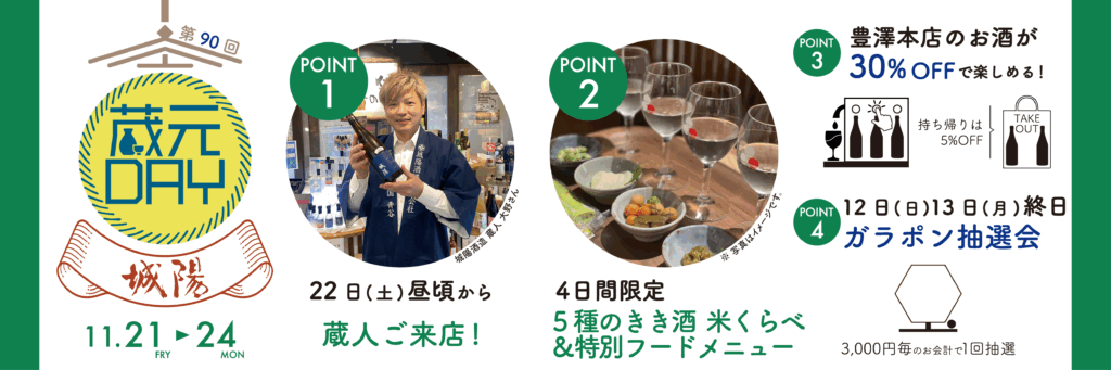 - 11月蔵元DAY@城陽酒造11月の蔵元DAY!は、11月21日(金)〜11月24日(月)に開催します! 今回は【城陽酒造】さん… 続きを読む: 11月蔵元DAY@城陽酒造