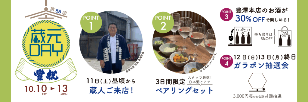 - 10月蔵元DAY〜豊澤本店〜10月の蔵元DAY!は、10月10日(金)〜10月13日(月)に開催します! 今回は【豊澤本店】さん… 続きを読む: 10月蔵元DAY〜豊澤本店〜