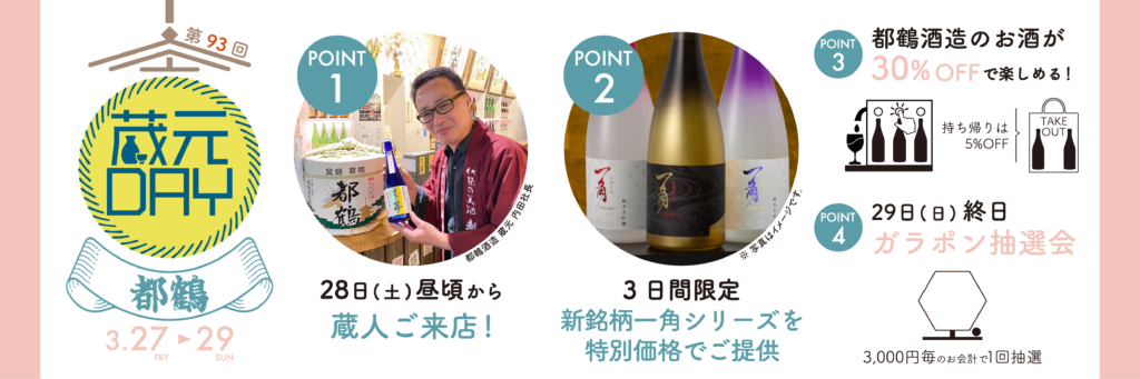 - 3月蔵元DAY〜都鶴酒造〜3月の蔵元DAY!は、3月27日(金)〜3月29日(日)に開催します! 今回は【都鶴酒造】さんです!… 続きを読む: 3月蔵元DAY〜都鶴酒造〜